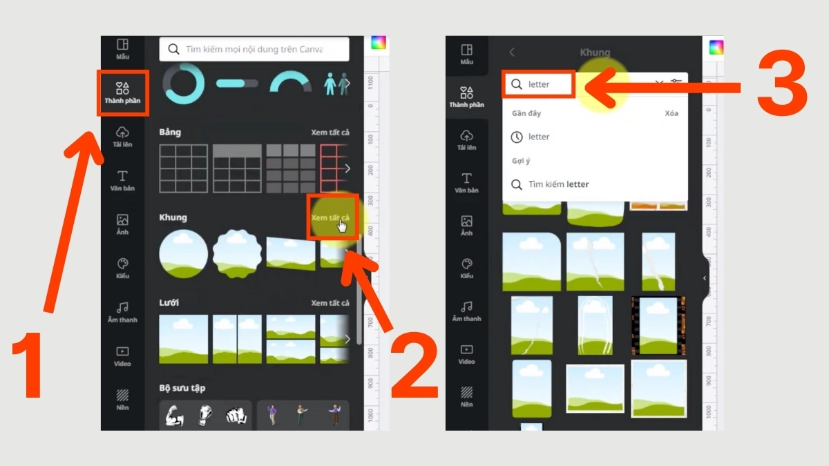Bạn bắt đầu bằng cách tạo một thiết kế mới trong Canva, sau đó vào mục Thành phần (Elements) và tìm các khung chữ cái (letter frames). Sau khi sắp xếp các chữ theo nội dung mong muốn, bạn chỉ cần tìm từ khóa “gradient” trong Elements và kéo nền chuyển màu vào từng khung chữ.