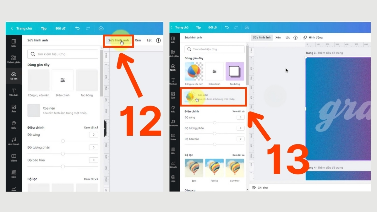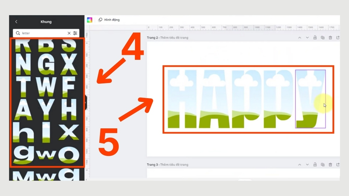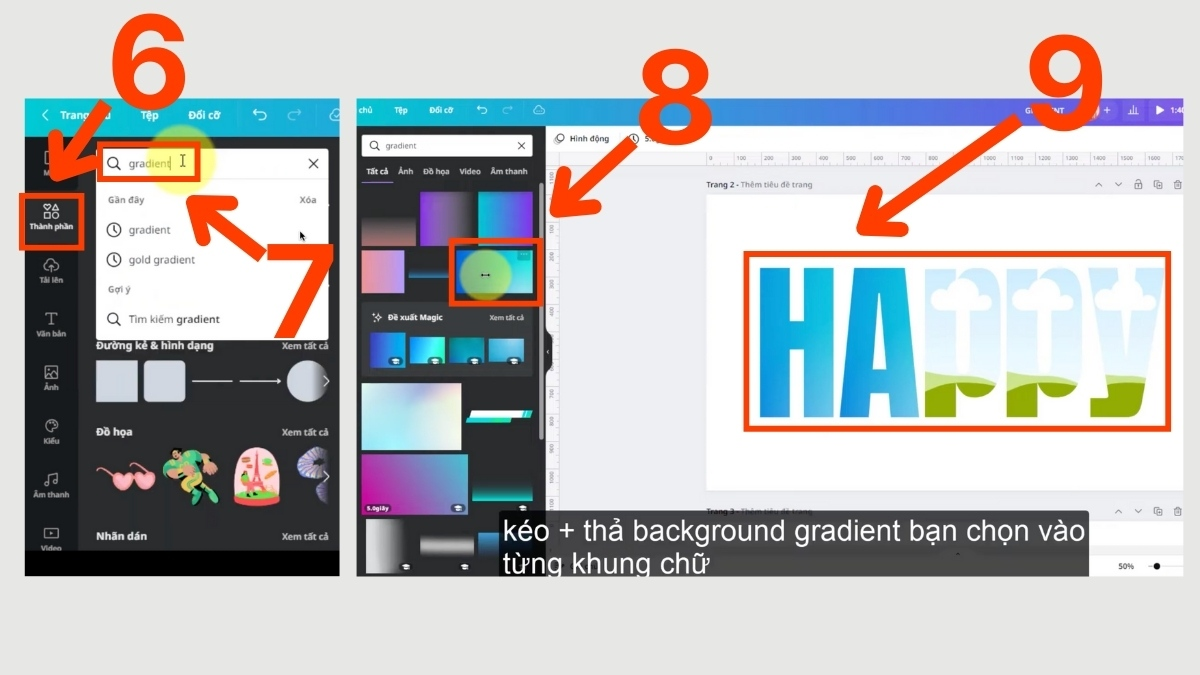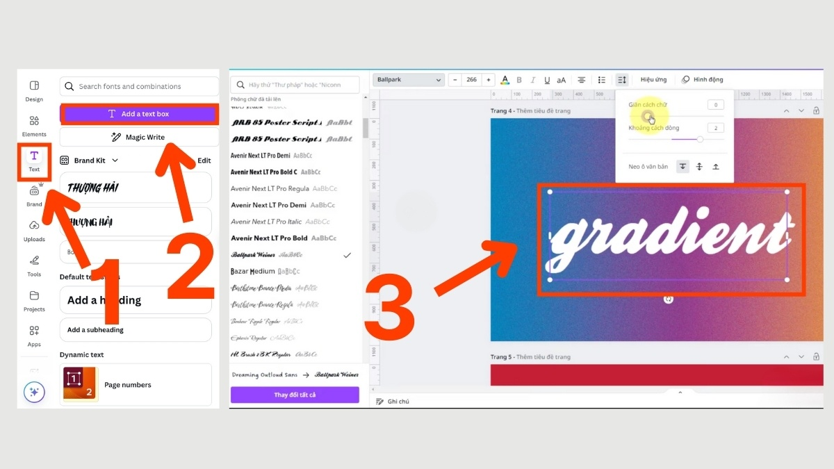 Cách này đặc biệt phù hợp khi bạn muốn mỗi chữ có sắc độ khác nhau hoặc cần bố cục chữ sáng tạo. Với Canva Pro, bạn có thể truy cập hàng nghìn mẫu gradient cao cấp giúp hiệu ứng chữ mượt và chuyên nghiệp hơn rất nhiều.