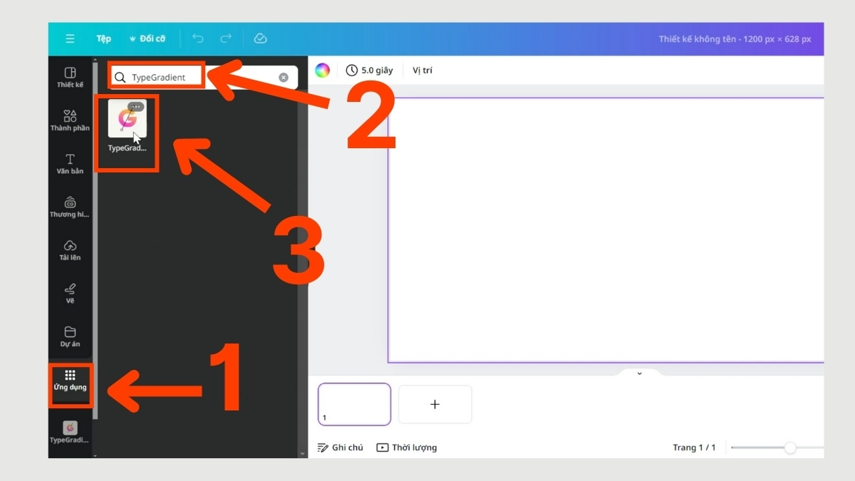 Đây là cách nhanh – gọn – đẹp nhất để tạo gradient text với Canva Pro. Trong giao diện Canva, bạn vào Ứng dụng (Apps) và tìm TypeGradient. Công cụ này cho phép bạn nhập nội dung chữ, chọn font, màu sắc và hướng chuyển màu chỉ trong vài thao tác. Bạn có thể tạo gradient nhiều màu, điều chỉnh hướng ngang – dọc – chéo cực kỳ linh hoạt.