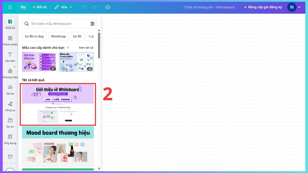 Đăng nhập Canva → chọn Whiteboard tại trang chủ hoặc tìm kiếm “Whiteboard”.